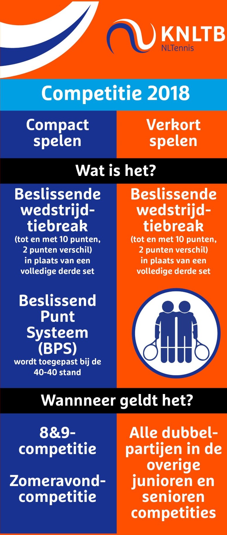Uit onderzoek blijkt dit de behoefte van vele tennissers. Tijdens de Voorjaarscompetitie van 2017 konden clubs daarom al kiezen voor Compact Spelen, wat inhield dat een wedstrijdtiebreak (tot en met 10 punten, 2 punten verschil) werd gespeeld als het tot een derde set kwam en bij 40-40 volgde direct een winnend punt. Dat werkte, maar vonden veel spelers een wel heel rigoureuze verandering. Bovendien was er onvrede over het feit dat de telling per speeldag anders kon zijn.